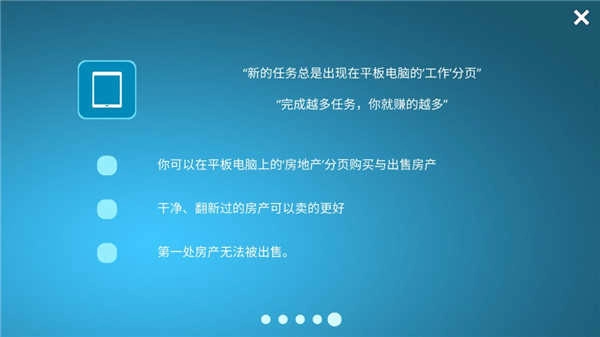 3、新任务均会在平板电脑的工作分页呈现,完成的任务数量越多,你的收益就越高。在平板电脑的“房地产”分页,你能够进行房产的买卖操作。那些整洁且经过翻新的房产,往往能卖出更好的价钱,不过第一处房产是不可以出售的。