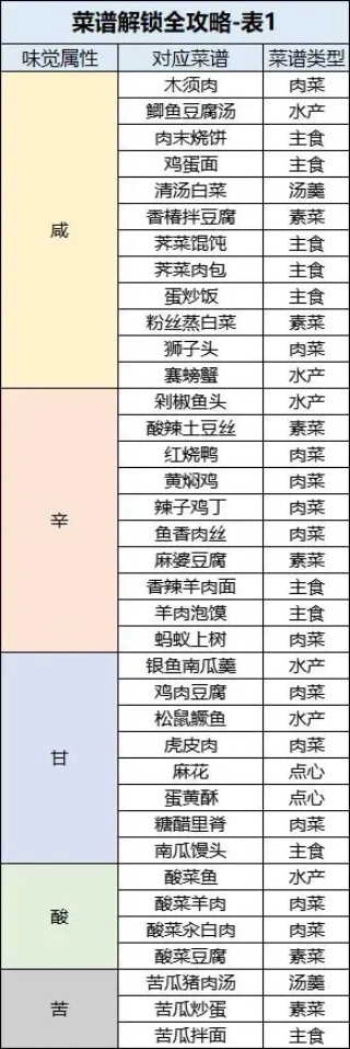 其主要涵盖5个部分:烹饪玩法的机制与作用、菜谱属性分类表、菜谱全解锁食材表,还有食材的获取等内容。