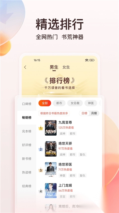 书架涵盖自带图书以及阅读类图书。其中囊括超具人气的网络小说,还有各类榜单。分类极为精细,区分男频女频,提供智能推荐,更有精选书籍推荐并支持追更!