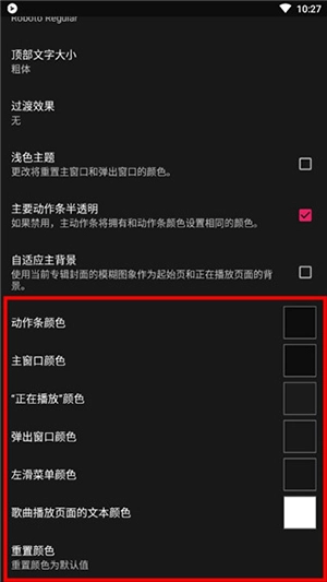 6、这里还可以切换动作条颜色、主窗口颜色、"正在播放"颜色、弹出窗口颜色、左滑菜单颜色、歌曲播放页面的文本颜色、重置颜色。