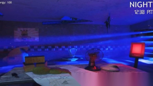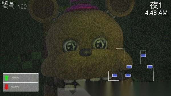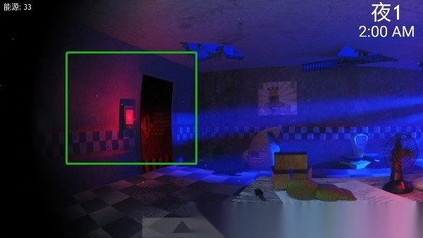3.进入摄像头视角,点击右下的蓝色方块可切换摄像头的的监视范围,在看到面包熊后你需要屏住呼吸,观察它的位置,然后再次点击下方的三角图,将视线拉回到房间。