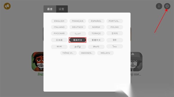 2. 轻点右上角的齿轮图标,就能切换语言,将游戏设置为简体中文。