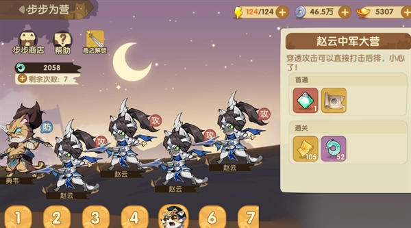 1、在步步为营中,敌方会派出多种多样的队伍组合前来迎战选择合适的阵容进行PVE挑战,逐步攻占对方军营!每日可以免费挑战5次步步为营,次数耗尽后可以消耗元宝购买更多挑战次数。挑战胜利消耗挑战次数,失败不消耗挑战次数。每次通关将获得青龙符、阵法精要等豪华奖励,首次通关还将获得步步宝箱与阵法碎片。