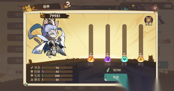 1、消耗修炼药剂进行角色培养,会随机对攻击、防御、生命、暴击四项属性进行增减;