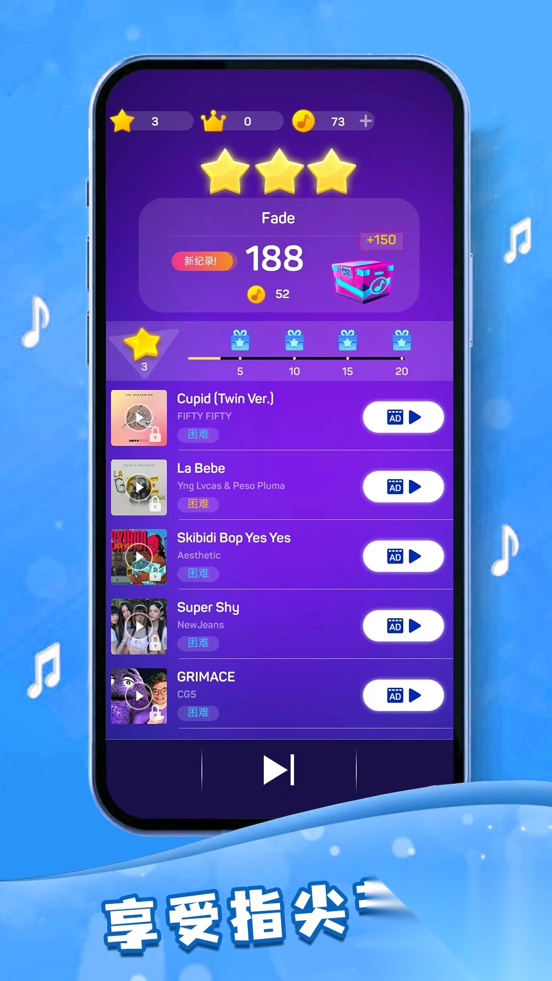 3、在此模式中,玩家要依据屏幕给出的提示,精准地点击或滑动音符,以完成不同难度等级的关卡任务。