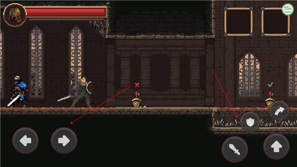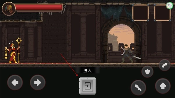 1. 左侧负责操控方向,右侧设有攻击、防御、跳跃、滚动等功能按键。