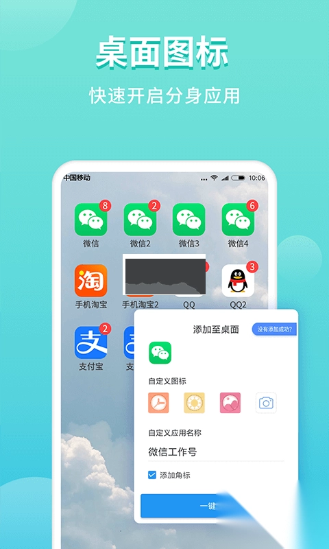 1、支持进行桌面分身,自行创建分身应用的快捷方式,将应用放置在桌面;