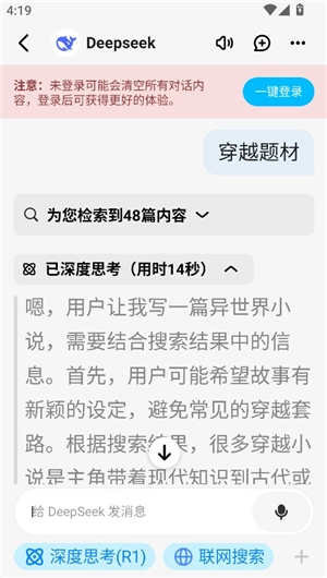 R1具备推理画图功能,支持暗黑模式,还拥有深度思考、图片分析、文件解析能力,并且设有玩法社区。