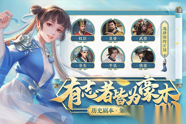 游戏拥有高自由的自定义玩法,开局可以自由选择出生的朝代、地域等多项属性,更有皇帝、权臣、侠客、将领、平民等多种身份任你选择扮演,自由体验不同晋升之路。