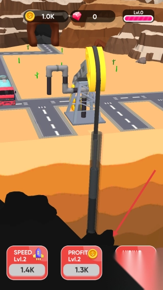 2、钻头到油井,持续开采,等红色卡车运资源,用金币升SPEED(Lv.2→Lv.3),提效率。