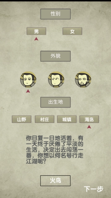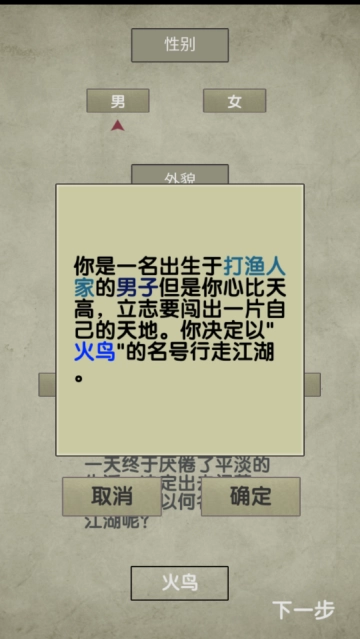 2、简洁美观的放空的武林游戏画面,精彩有趣的剧情故事,你可选择性别和昵称,创建角色