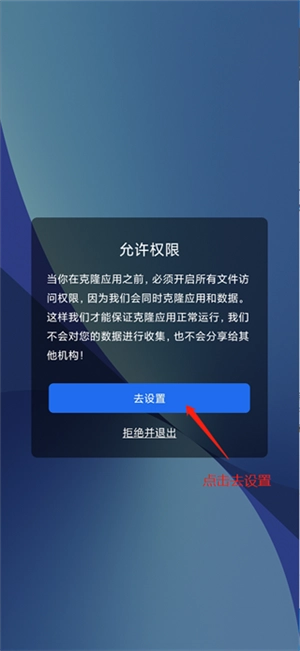 1. 于本站下载双开空间,打开软件后会弹出允许权限窗口。因克隆应用需开启一些必要权限,故而点击【去设置】,进入权限设置界面。