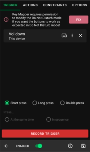 2. 你可以从四种不同的设置中选择。打开“不覆盖默认操作”将意味着键映射器不会取代触发器的正常操作,而是执行键映射和默认操作。