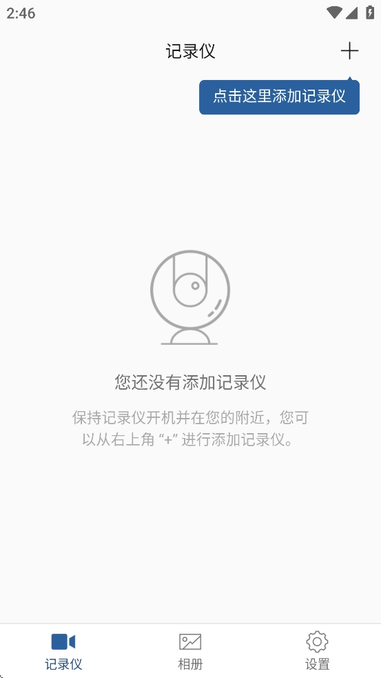 请先下载并安装“dvr on road行车记录仪”APP,安装完成后打开该应用。进入记录仪的首页界面,然后点击页面右上角的“+”号。