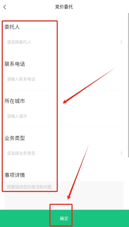 3、在新弹出的委托信息填写页面,依次输入委托人姓名、联系电话,以及准确选择业务类型,点击下方的 “确定” 按钮即可。