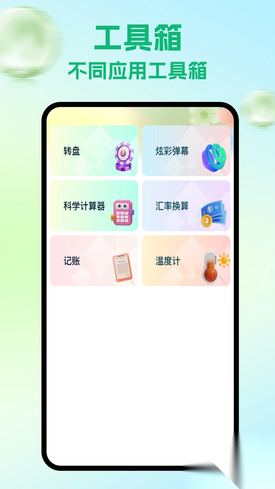 2、有多种工具箱的功能,可以使用转盘、炫彩弹幕、科学计算器、汇率换算、记账以及温度器等功能;