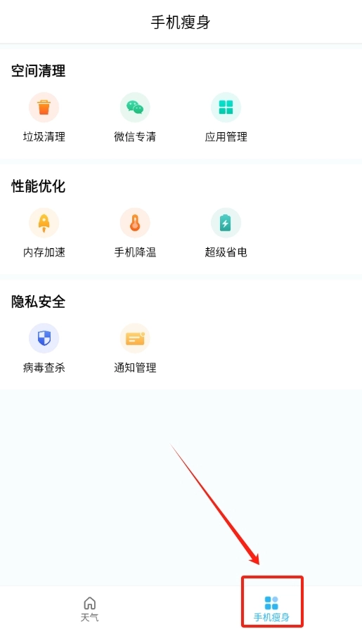 3、在软件中,还有手机瘦身页面。点击进入该页面,即可清理手机内存,使手机运行更加流畅。