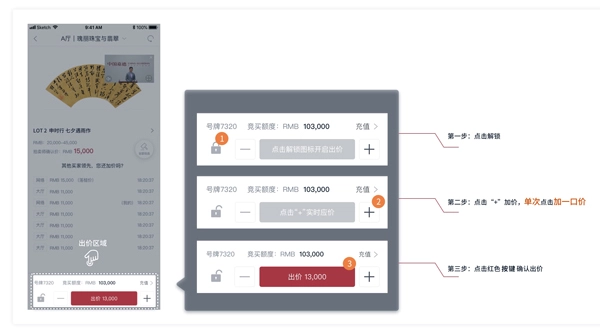 专场开拍后,可进入专场观看直播进行实时出价。竞买人可以点击“+”、“-”选择出价金额,点击“+”后,红框中将出现下一口金额再点击红色出价按钮以确认出价。