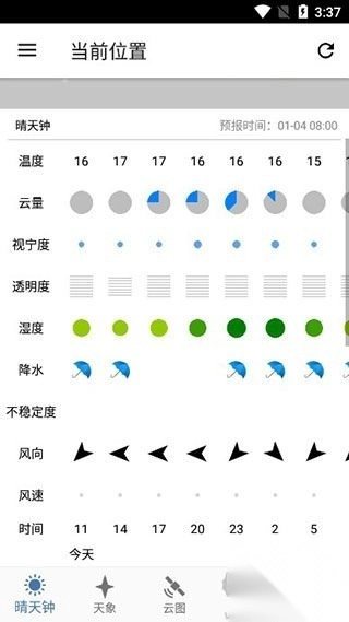提供逐小时温度、湿度、风力、云量、视宁度及透明度等专业气象数据预报。