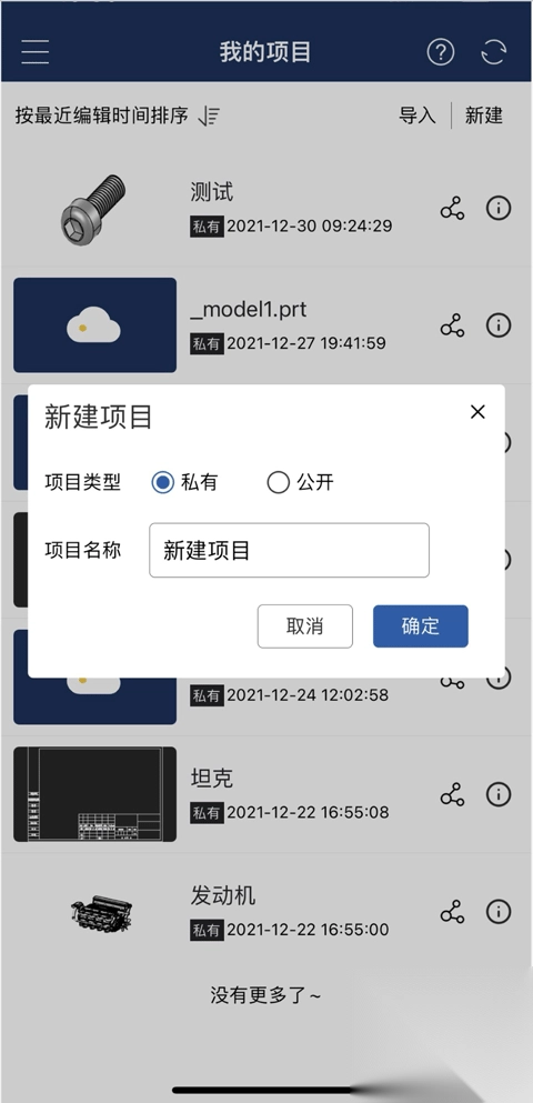 3、新建: 点击“新建”,在手机底部弹出新建菜单,可以选择新建项目或文件夹。 选择新建项目时,可选择项目类型为私有或公开。新建项目时默认自动创建一个空的零件与装配文档。