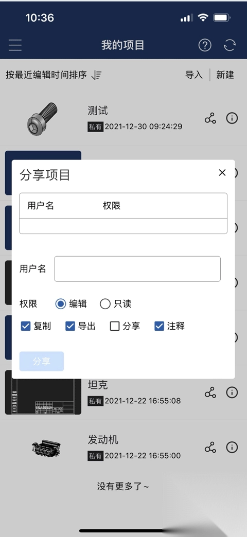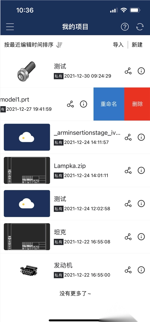 2、导入: 点击“导入”,显示当日可用的导入次数,在手机文件中选择支持的模型格式,选择后开始进行导入。支持的模型格式为:IGES、STEP、PTC、NX、CATIA、SolidWorks、ParaSolid、OBJ、STL、IFC、3DM、Revit、PDF、DWG。 (说明:在项目管理界面导入的文档自动创建一个项目,项目中显示导入的文档。)