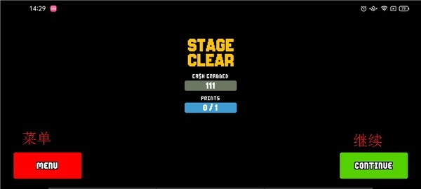 13、关卡结算界面会显示我们获得的现金和印刷品数量,点击菜单返回主界面,点击继续开始下一关的挑战。