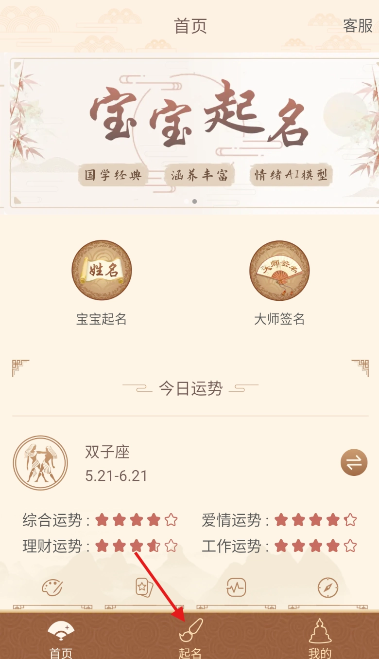 1、打开软件后点击导航栏中的 “起名” 选项,进入起名功能页面。