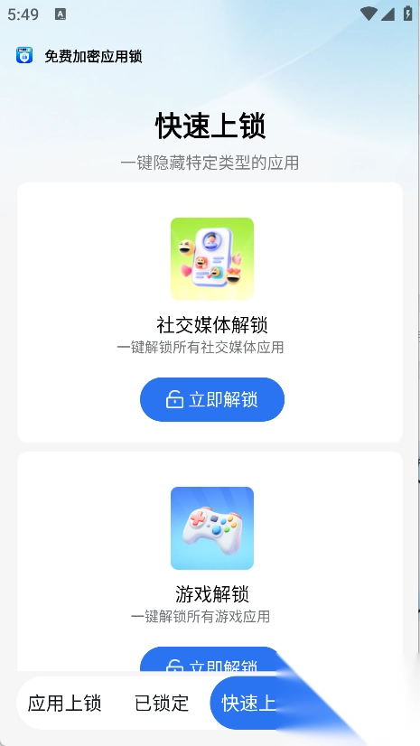 2. 只需一键,就能快速为各类应用上锁,给予你的应用更周全的保护。