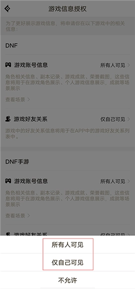 3、当进入游戏信息授权界面时,点击游戏账号信息右侧标注为“所有人可见”的选项。