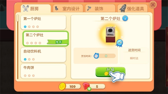 6、通关后点击主界面左下方的按钮可以对餐厅进行升级。