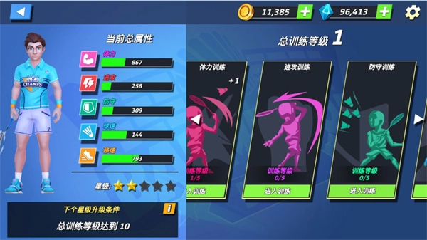通过各种方式获取训练卡,通过消耗训练卡分别对体力、进攻、防守、球速、移速属性进行训练升级和加强。