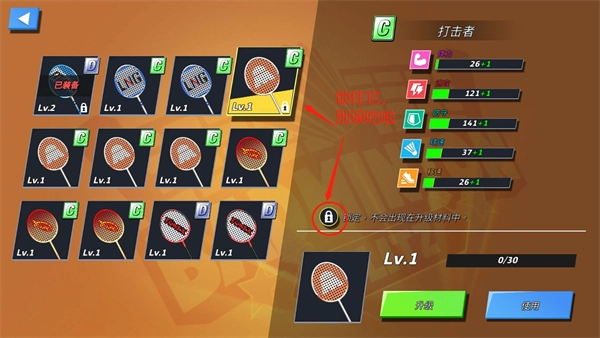 升级主球拍的方式是消耗其他球拍的经验,通常是用低级球拍来提升高级球拍的等级。新手们务必留意,能够把高级球拍锁定!锁定!锁定!千万别不小心当作经验消耗掉啦!!