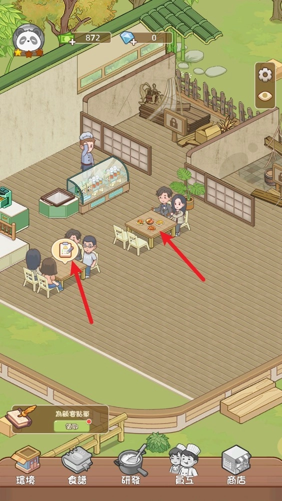 1. 当进入熊猫食物屋游戏,便会有客人来到餐厅就餐,第一步,我们先点击菜单图标来进行点餐。