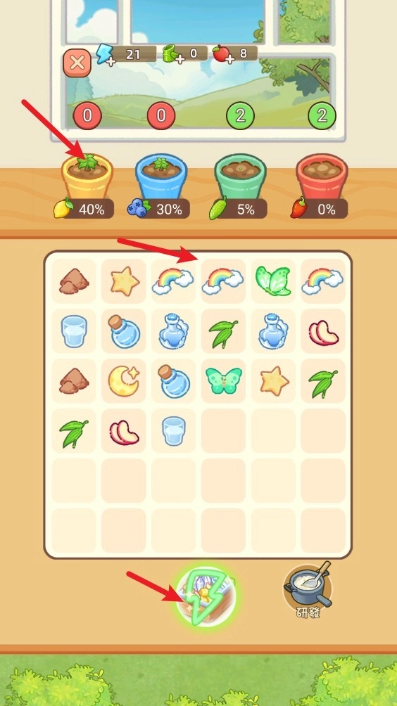3、在此处,玩家仅需耗费体力就能提供元素,接着借助合成促使上方盆栽生长,如此便可获取相应材料。