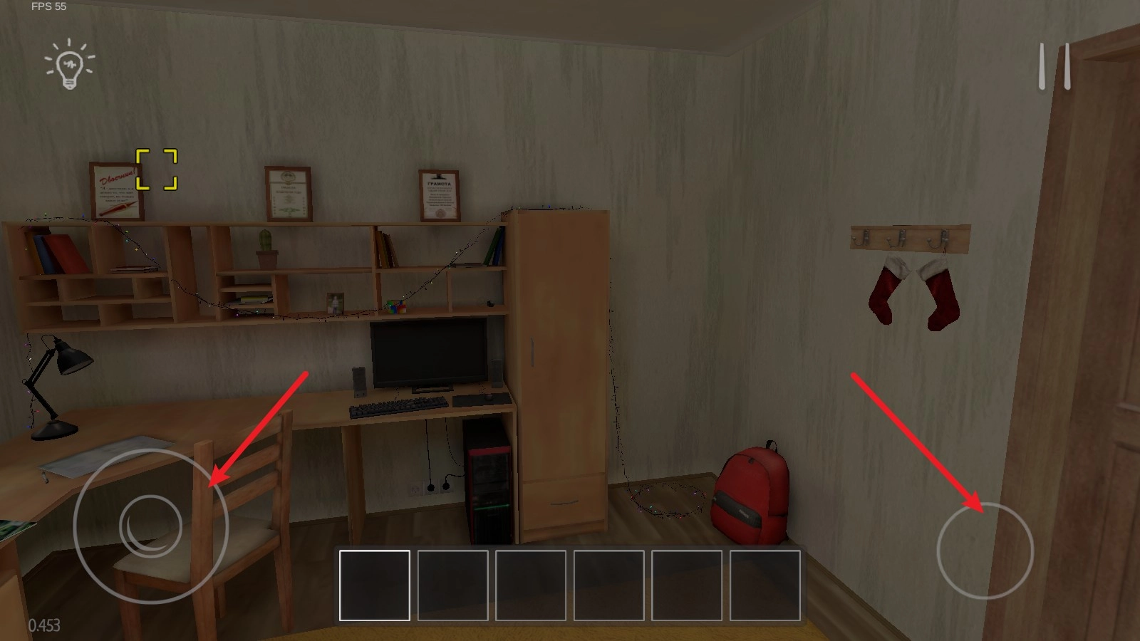 1. 游戏启动后,玩家会出现在自己的房间之中,依靠左侧摇杆来操控角色移动,右侧按钮用来控制角色起立和下蹲动作。