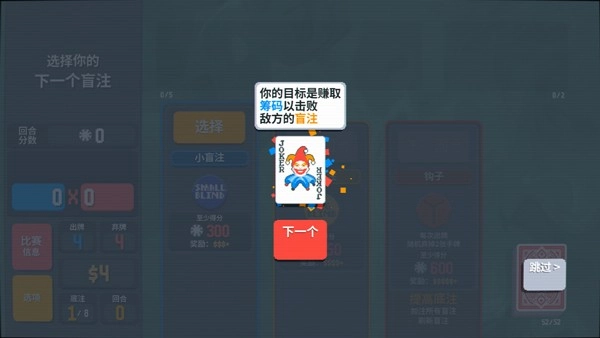2、游戏中有简单的新手教程,游戏目标是赚取筹码击败地方的盲注;