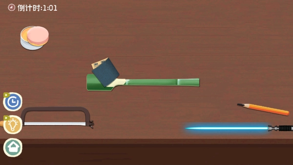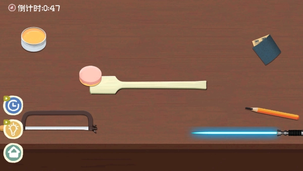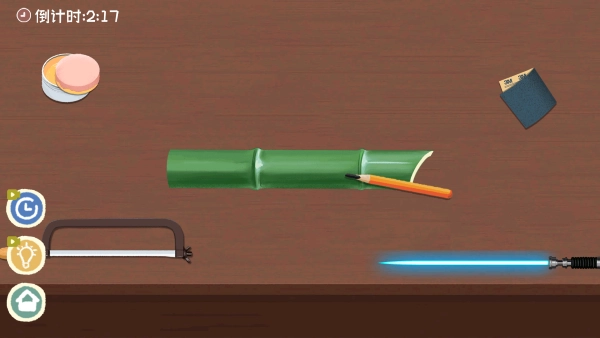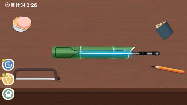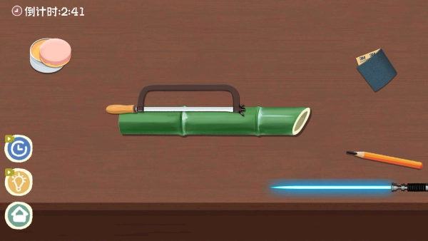 进入步骤,先拿起锯子放在竹筒上。