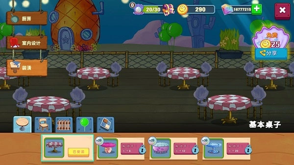 4、妙趣横生的海底世界,和海绵宝贝一同在这个游戏中经营美食。