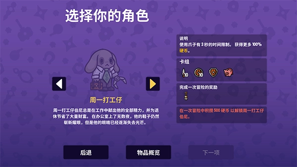 可恶的地牢领主盗走了你的兔子爪,无奈之下你只好用一只生锈的爪子取而代之。现在,穿越阴森的地牢,去夺回你失去的肢体与财富。