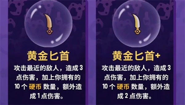 能够朝着邻近的敌人发起攻击,给予其3点伤害。当拥有10枚硬币时,还可额外造成1点伤害。要是进行了升级,便能够直接提升道具的额外伤害。不仅如此,该道具还能与磁石以及迈达斯之手组合使用,到了游戏后期,就能轻松打出高额伤害。