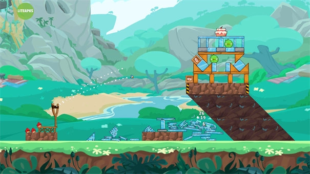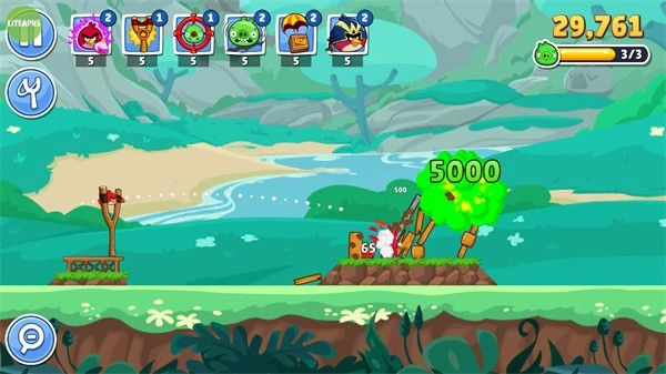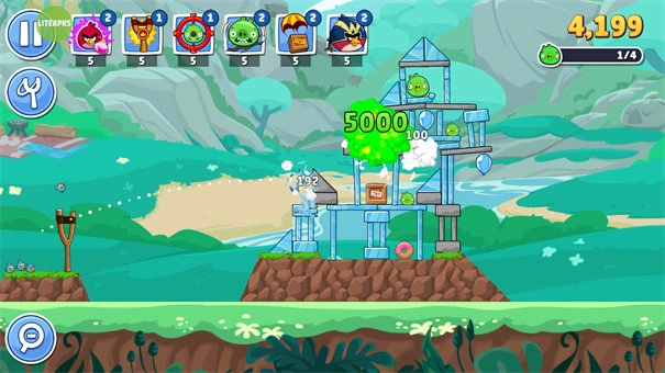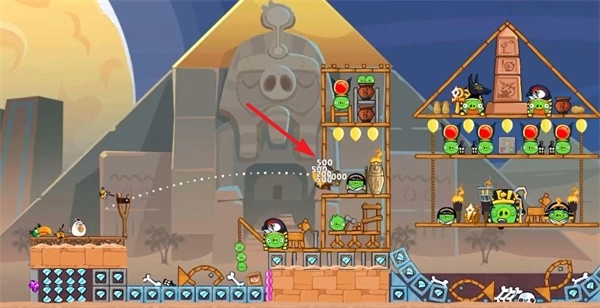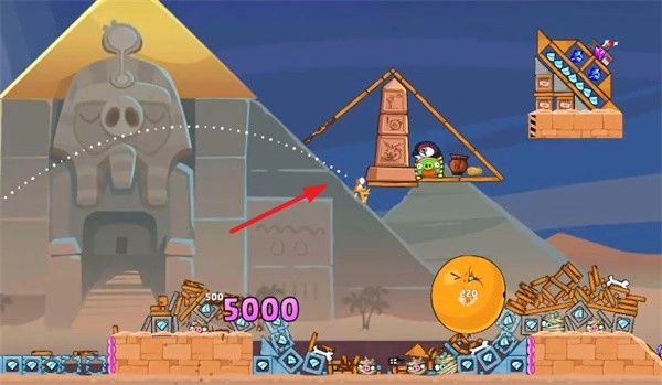 2、在左侧能够拉动弹弓,把小鸟发射出去,击中前方的物品,就像图中所示,如此一来,下方的建筑物几乎瞬间被摧毁。