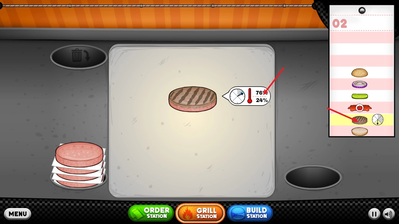 2、到烧烤台煎肉饼,肉的熟度是根据指针提示的,达到要求才行;