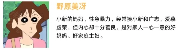 7. 野原美冴,小新的母亲。她性格较为急躁,偶尔还会表现出暴力的一面,常常对小新和广志施以肢体动作。她存在爱慕虚荣的特点,然而,在她内心深处,其实是非常善良的。她是一位全心全意呵护家人的优秀妈妈,也是一位称职的家庭主妇。