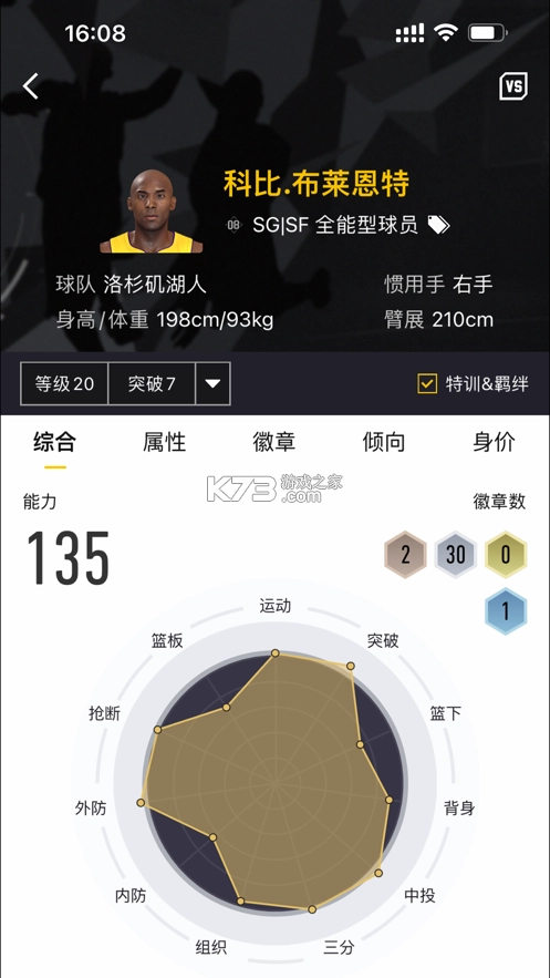 NBA2KOL2助手可查询球星每个等级每个突破下的属性与徽章内容,此外,还可以查询球星与上一个版本的能力值、属性、徽章的变化。