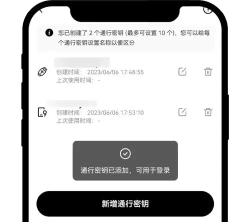 成功创建通行密钥,您可以在通行密钥页面查看详情
