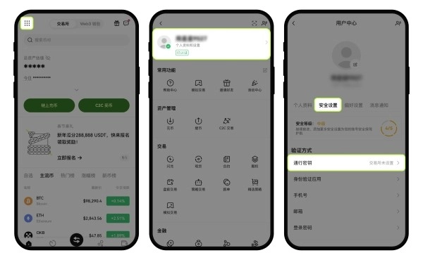 1、点击全功能图标,选择【个人资料和设置】;点击【安全设置】 —【通行密钥】—【启用】。