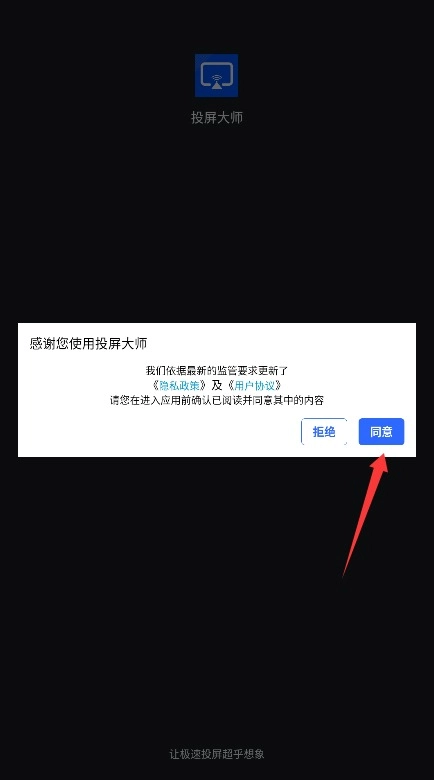 1、启动万能投屏大师APP,仔细阅读用户协议与隐私政策后,点击同意按钮进入。