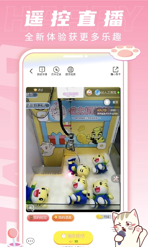 喵太抓娃娃手游,一款超好玩的休闲抓娃娃游戏。玩家在游戏里,随时随地都能抓娃娃,解压效果一流。要是积分够多,还能把真实的娃娃抱回家哦!游戏操作简单有趣,新手玩家轻松就能上手。喜欢这类游戏的玩家,别再犹豫,赶紧下载畅玩,就等你加入啦!