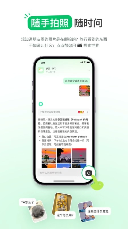 点点生活搜索免费app官方正版,堪称生活中的得力助手。它融入了AI技术,遇到不懂的,只需搜索一下就能知晓答案,就如同一个万能工具箱。无论是查百科,还是有不懂的问题,只要输入文字,就能轻松获得解答,适用场景极为广泛!