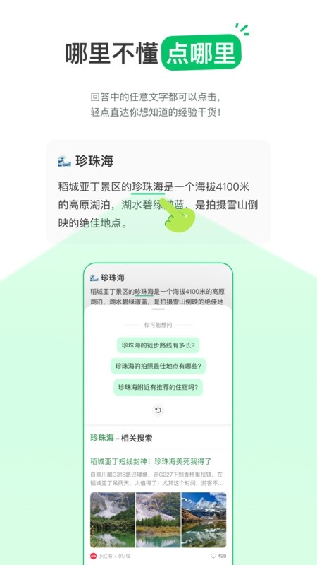不想打字?不愿开口?在点点的回答里,你只要点击任何你感兴趣、想深入探究的地方,点点就能基于你的兴趣,帮你想出三个相关问题。